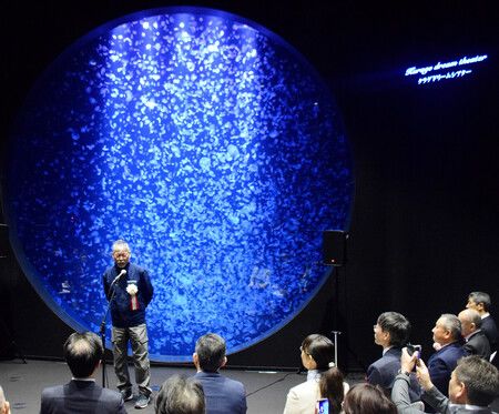 鶴岡市立加茂水族館のリニューアル記念セレモニーであいさつする奥泉和也館長(奥)=3月31日、山形県鶴岡市