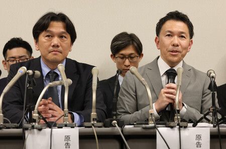 大川原化工機冤罪(えんざい)事件で、国を提訴後に記者会見する同社元顧問の長男(手前右)と次男(手前左)=6日午後、東京都千代田区