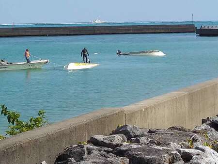 辺野古沖で転覆し、岸壁近くまでえい航された2隻の船=3月16日、沖縄県名護市