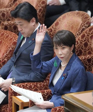 衆院内閣委員会で挙手する高市早苗首相(手前)。奥は木原稔官房長官=17日午前、国会内