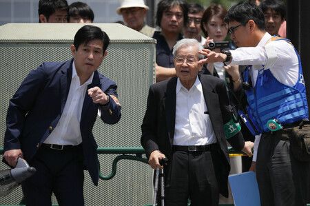 事故現場で行われた実況見分の際の高橋哲さん(左)と飯塚幸三元受刑者(中央)=2019年6月、東京都豊島区