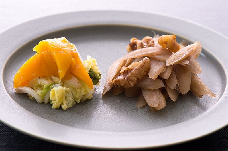 白菜の酢の物、マンゴー添え(左)と、ごぼうとくるみのメープルシロップ煮(右)