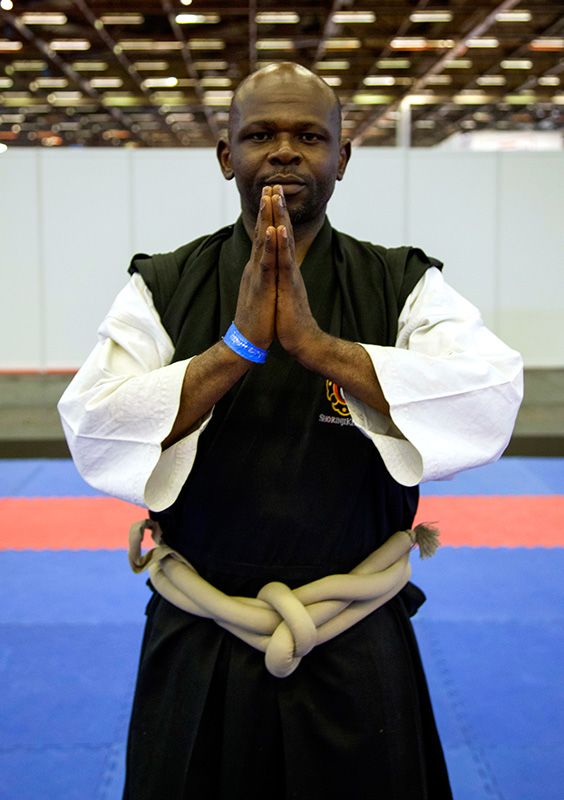 1972年にフランスで最初の少林寺拳法道場を開いた青坂寛(あおさか・ひろし)氏の門下生で同3段のセバスチャン・キトコ氏(写真右端)は、「ジャパン・エキスポでは、普段は接点がないような人々との交流があります。これまで武術をやったことがなく、漫画で見た技や“型”が実際にどんなものか見てみたいという興味でやってくる人たちです」と話す。
