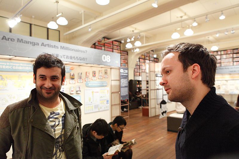 「観光で京都に行こうとガイドブックを読んでいたら、マンガミュージアムを見つけて胸が躍ったね。日本との最初の接点だって、考えてみたらマンガだからね」と話すのはドイツから来たファルザムさん(写真左)。「『デスノート(※2)』とか『銀魂(※3)』が好き。ドイツでは『ドラゴンボール(※4)』のような有名マンガ以外は、高すぎて買えなかったから、よく図書館で借りて読んだんだ。でもマンガだけのこんなに巨大な図書館があるなんて想像していなかったね」と15年来の日本マンガファンを自称するだけあって感慨深げ。