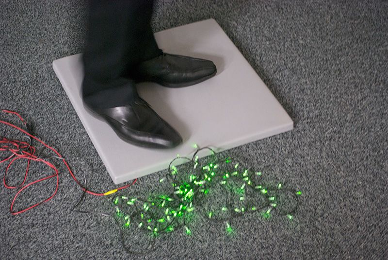 振動力発電による電力は、LEDを発光させたり、無線を送信したり、音を発生させたりすることができる。これらの機能を使った技術開発が進んでいる中、発電床は、歩くと矢印が点灯して進行方向を示す廊下などに実用化された。「発電床は、配線が必要ないのでどこにでも持って行けます」と速水氏が説明するように、発電床は屋内屋外問わずどこでも使うことができる。大規模な照明はできないが、その分、発電時の環境負荷は小さく、設備の維持や保安など電気の管理も必要がないなどのメリットがある。