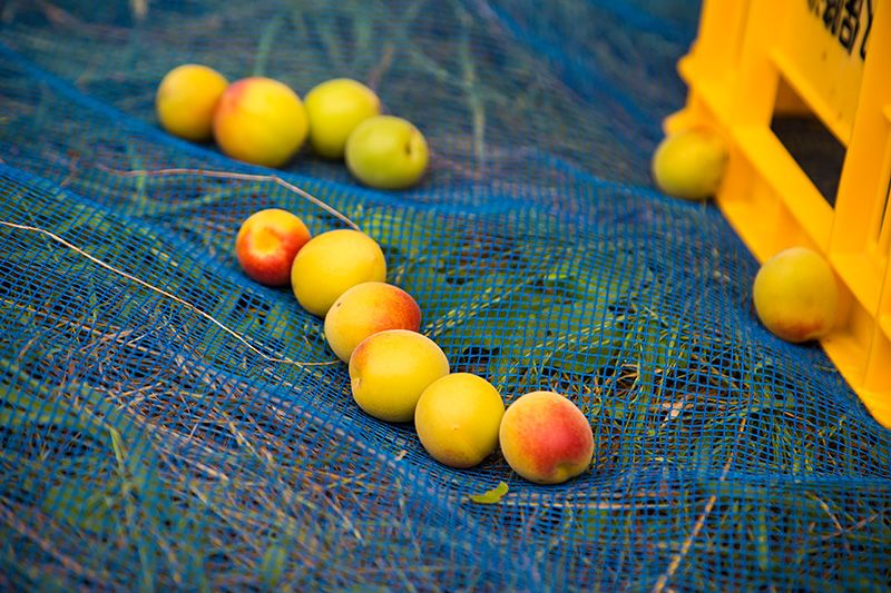 そのため梅農園では、収穫期前に地面をネットで覆い、落下で実が傷付くことや汚れることを防ぐ。傾斜地では、転がった梅の実が集まるようにネットの設置を工夫することで、網ですくいやすくしている。