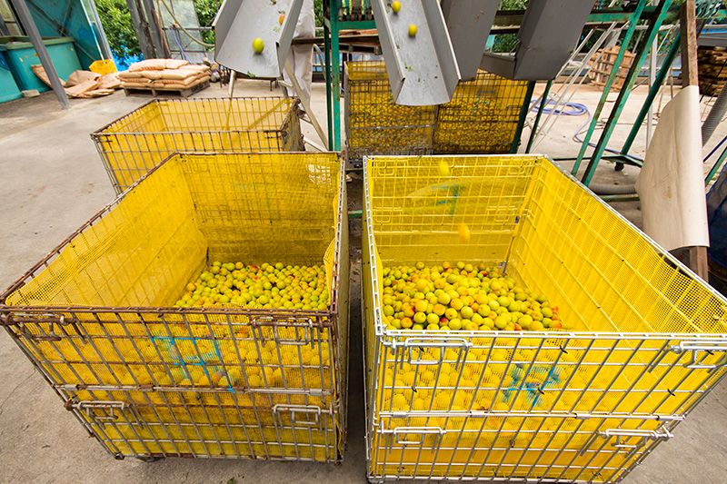 収穫された梅の実はビニールハウスに運ばれ、すぐに選果作業に入る。葉っぱなどのごみや、大きな傷がある実を取り除いた後、サイズごとに分類していく。