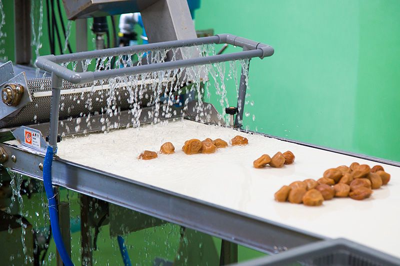 その白干し梅を洗浄し、さまざまな味付けに漬け込み、包装するのが工場での作業だ。勝僖梅では、まず初めに、静菌効果のある活性水で洗浄する。