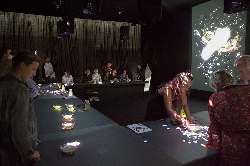 真っ暗な空間で、一杯のお茶を待つ。目の前に差し出された茶碗に緑茶が注がれると、その水面に鮮やかな花々が映し出され、咲き始める。茶碗を手に取ってお茶をいただく。花は形を変え、音をたてながら四方へ散ってゆく。再び茶碗を卓に置くと、また新たな花々がそこに宿る。茶碗が空になると、もう花は咲かない。お茶のひと時が終わった合図だ。