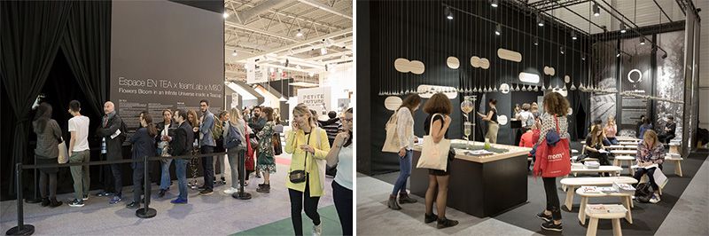 高感度な業界人が集まることで知られる「メゾン・エ・オブジェ」。会期中、デジタルインスタレーションの空間の入口には絶えず行列ができた(左)。その横には、EN TEAのお茶4種(水出し緑茶はプレーンとゆず味、ホット緑茶は桧フレーバーと杉フレーバー)が試飲できるスペースが設置(右)。