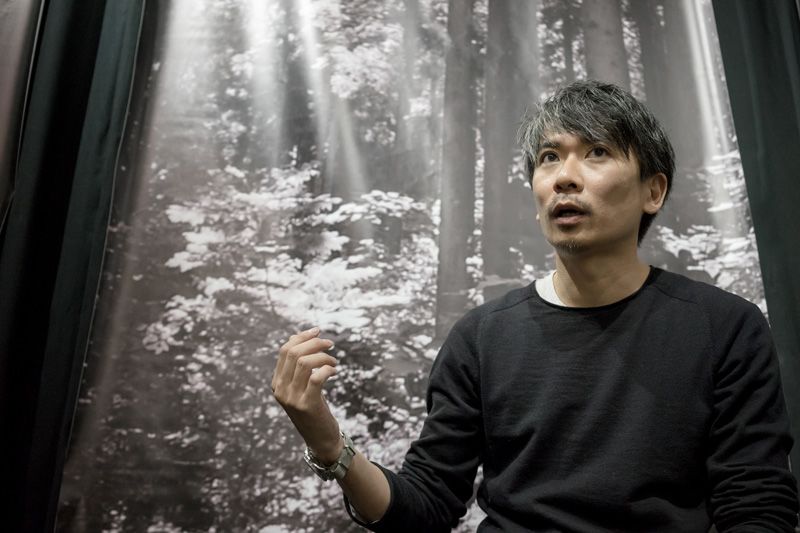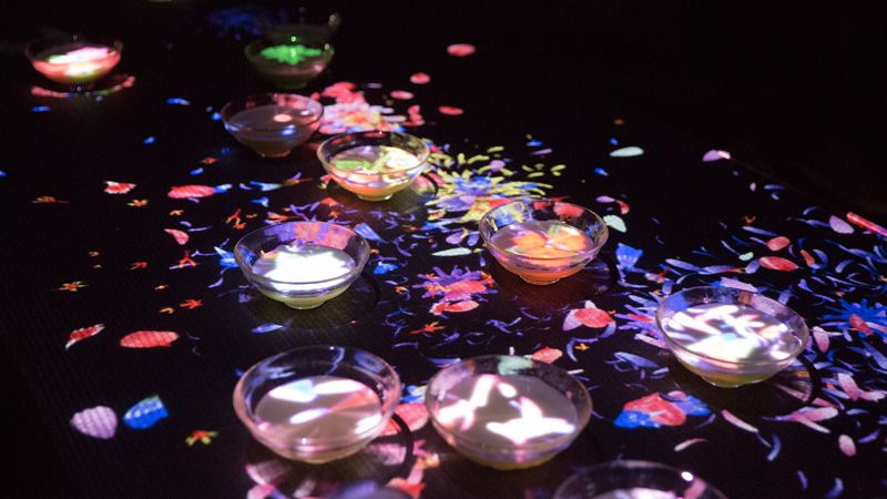 「一杯の緑茶の中にだけ存在する作品を考えました。茶碗の中に季節の花が咲いて、お茶をいただくたびにキラキラと音をたてては散り、消えていく。音もBGMではなく、花の散るタイミングや鑑賞者の動きによって変化します。もう二度と同じ瞬間には出会えない、という作品です。『生命を思い、生命をいただく』感覚だと僕は思っています。『儚さの味』なんです。それと同時に、境界線のない暗闇の中で舞い散る花びらを共有しながら、隣の人とのコミュニケーションが自然に生まれたりするのも、この作品の魅力かもしれません」(チームラボ 工藤岳)