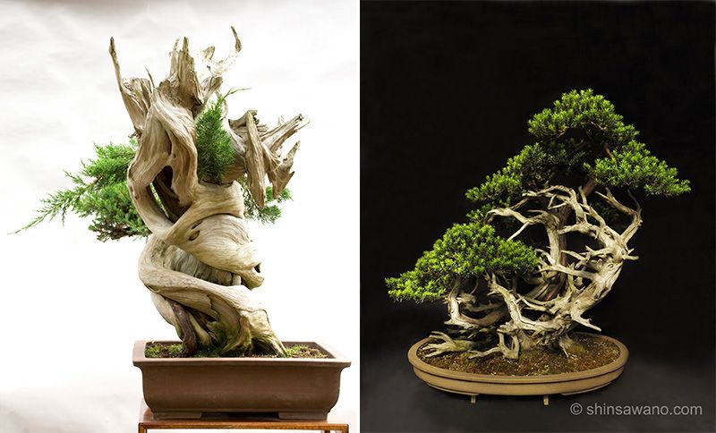 (左)樹高95cm、樹齢1000年以上の東北真柏。銘は「階(きざはし)」(撮影=杉崎 美穂)、(右)樹高100cmの加賀一位(撮影=澤野 新一朗)