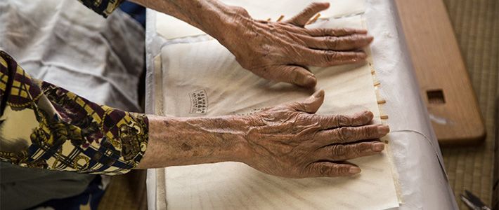 紙貼り。竹ひごの薄さ、編み込みの間隔、和紙の表裏も触るだけで分かるという熟練の手