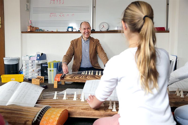 2017年3月末のある晴れた日、横浜インターナショナルスクールが附属キャンパスとして保有する日本家屋の2階で、小学校5年生の箏のクラスを参観した。まず、ウォーミングアップに、パターソンさんがランダムに箏の弦をはじき、3音階を弾く。それに続いて生徒たちが正確に同じ音階を奏でていく。次に、譜面が配られ、声に出して楽譜を読んだ後、パターソンさんと一緒に主旋律を奏でる生徒たち。彼らは、パターソンさんが副旋律を乗せても、乱されずにきちんとメロディーを弾き続け、綺麗な2重奏が繰り広げられた。「子供たちの習得の早さにはいつも驚かされます」とパターソンさん。「箏が持つ表現力への理解も、目を見張るものがあります」