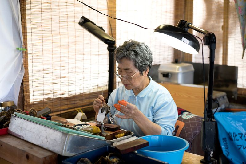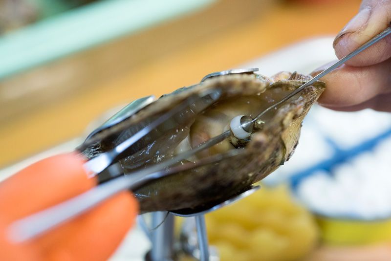 井上さんは三重県志摩市の立神(たてがみ)で「井上真珠」を経営している。ここで真珠貝に「核」を挿入する繊細な作業を任されているのは、熟練した技能を持つ地元の女性たちだ。1日8時間の作業で核入れできるのは1人500個ほど。根気が必要で、かなり骨の折れる仕事だと言う。