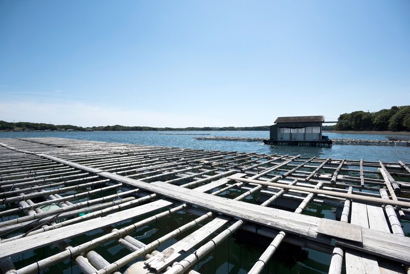 防潮堤に建てられた小屋の数メートル先に、柱と板を組み合わせた真珠いかだが浮かんでいる。真珠貝の稚貝は手のひらに収まるほどの大きさで、このいかだにつるされ4年かけて育てられる。