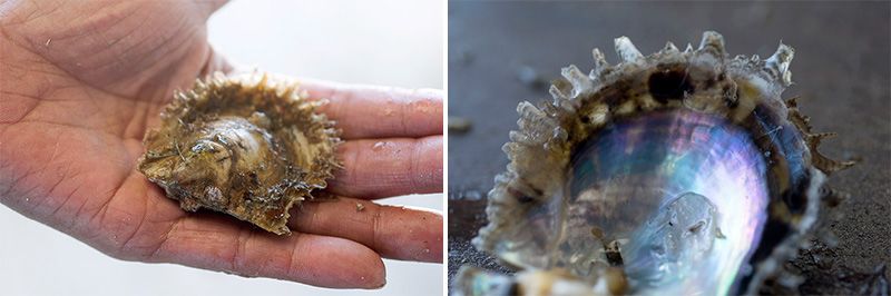 女性たちが真珠貝の表面の付着物を取り除く。4年間かけて真珠が育つまで、何回かこの作業が繰り返される。