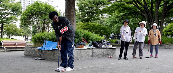 バナー写真=ふらりと立ち寄った都内のゲートボール場でプレーを楽しむロバートさん