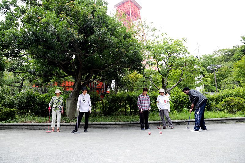 日本での最終日、ロバートさんは、東京タワーの真下にあるゲートボール場を訪ねた。「『リレーション-3』で一緒にゲームをしましょう」と、プレーをしていた数人の女性から声を掛けられた。