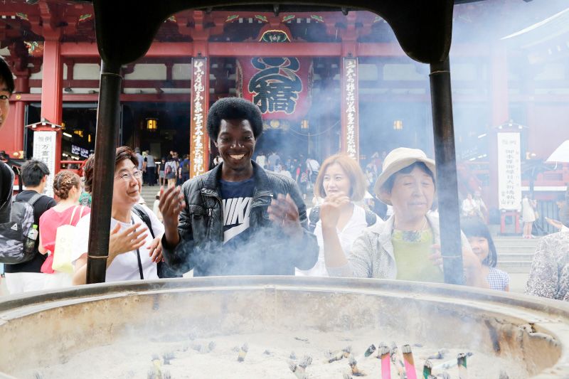 浅草寺では、寺を参拝するときの作法を教えてもらい、神妙な面持ちで、水で手と口を清めてから、おさい銭を入れて合掌。香炉の煙を身体にかけて健康を祈願したり、おみくじを引いたり…。その全てが初体験で新鮮だというロバートさん。