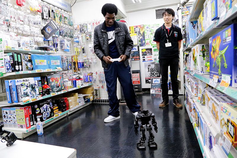 秋葉原のロボットショップで、リモコンロボットのリズミカルな動きに歓声を上げる