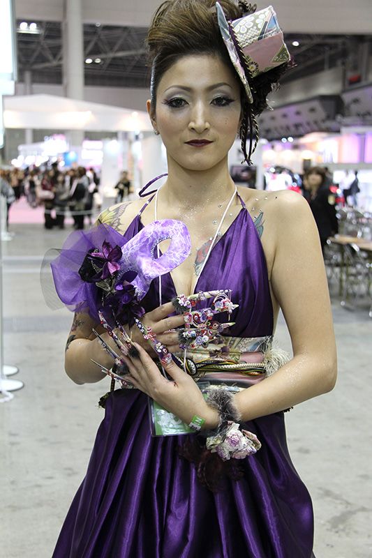 (左)日本ネイリスト協会が「ネイル月間」の11月に開催する「東京ネイルエキスポ」。第17回目の2012年は、2日間で5万4千人が訪れた(2012年11月18日、東京ビッグサイト) (右)ネイルエキスポの目玉のひとつ「ネイティフルコンテスト」。ネイル、ヘア、メイク、衣装までのトータル・コーディネートで審査する(画像提供=NPO法人日本ネイリスト協会)