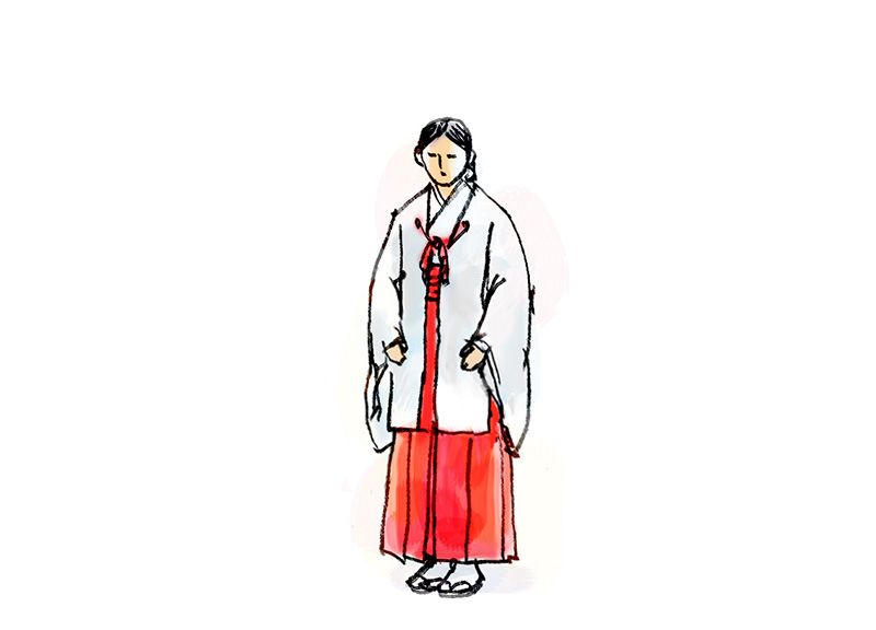 ちなみに、巫女は神職ではなく、補佐役である。「緋色の袴」が特徴で、社務一般を行う。神職と異なり資格はとくに必要ないが、一般に未婚の女性とされている。