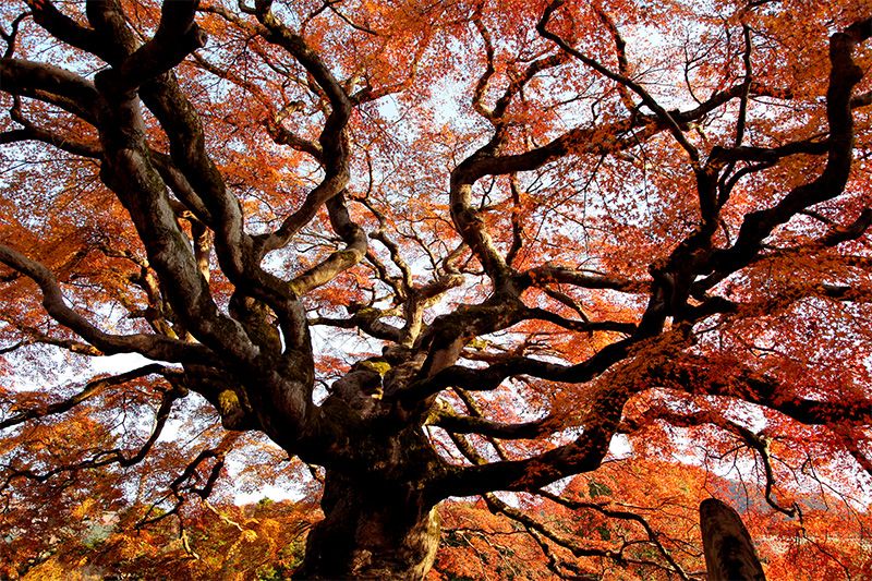 日本の紅葉は世界でもっとも美しいと言われることが多い。落葉広葉樹の種類が豊富なためだ。特にモミジは紅葉の代名詞であり、見事に色づくことで知られる。山や谷を美しく彩るだけでなく、神社や古い日本家屋とも絶妙に調和する。ただし大きさで言えば、巨大に成長するモミジはほとんどない。