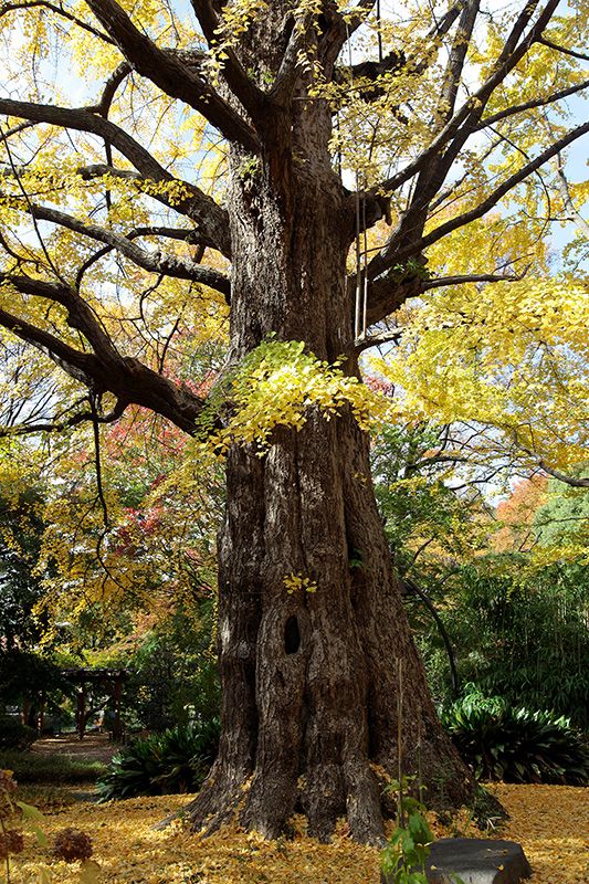 葉が色づく巨木で目につくのは、イチョウやケヤキ、サクラなどが中心となる。その中でも、きれいに色づく巨樹の代表はイチョウであろう。カツラの黄葉も雄大ではあるが、主に山奥に分布するため、なかなか人の目には触れずじまいだ。一方、人里を中心に植えられるイチョウは、街路樹や神社の御神木としてもおなじみで、日本人の多くが親近感を抱く木と言える。