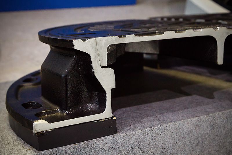 その結果、高度な技術力が求められている。ガタつき防止のためには、ただ蓋を載せるだけの平置きではなく、蓋と受枠に角度を付けることで密着させる「急勾配受け構造」を採用している。そうすることで開閉もスムーズになるが、成型には精密な加工が必要となる。白井さんは、「ボルトやパッキンなどの手段を使わずにガタつきを止めているのは、日本のマンホール蓋だけです」と誇らしげに言う。