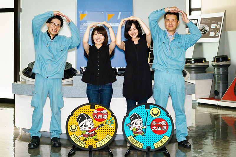 左から白井さん、広報の和田なつみさん、高橋璃花子(りかこ)さん、荒川さん。栃木工場のある大田原市のデザインマンホールと共に「マンホール・ポーズ」