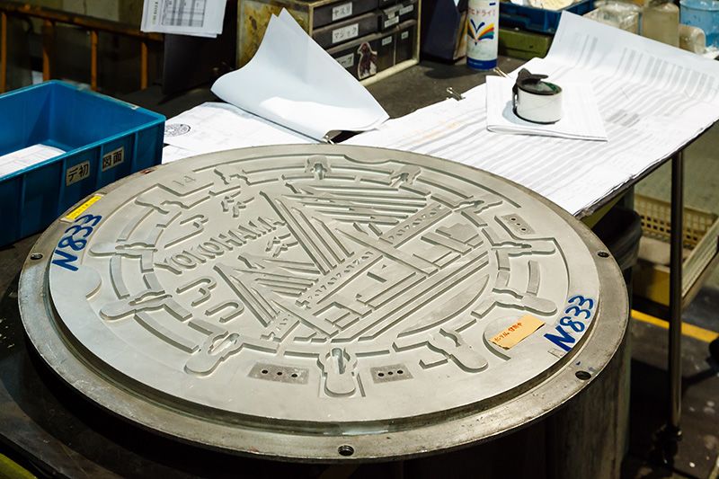 アルミニウムでできた母型(おもがた)。これがマンホール蓋の原型だ。写真はベイブリッジをデザインした横浜市の物。