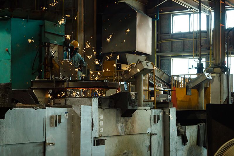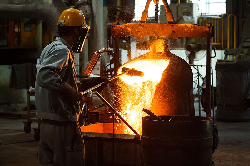 マグネシウムや硫黄などをスクラップ鉄に加えて、強度や耐食性を備えた「球状黒鉛鋳鉄」を造成する。