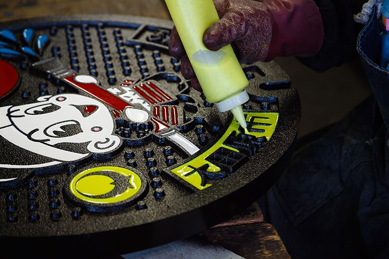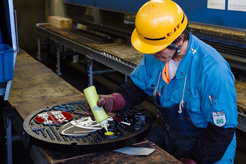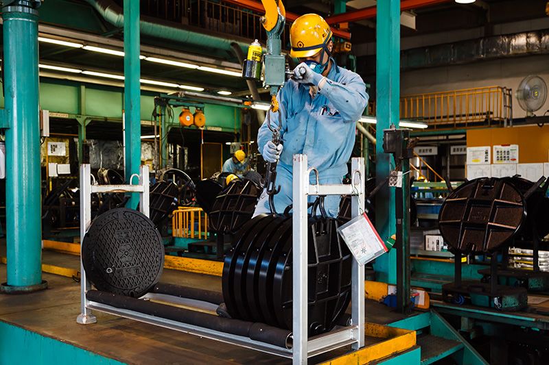 2016年に発行が始まった「マンホールカード」の流行などで、現在は空前のマンホールブームとなっている。しかし、着色されたデザインマンホールは全体のわずか1%未満で、ほとんどが地道に下水道を支える黒いマンホール蓋だ。その構造や機能、そして日本の下水道システム自体にもっと注目してほしいと生産部部長の荒川健彦(たけひこ)さんは言う