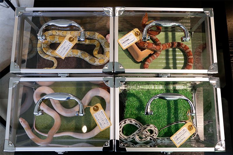 店にいる蛇のほとんどは、世界中でブリードされているコーンスネークやキングスネーク。毒はなく、さまざまな色や模様がある。アルビノ(白蛇)は希少で高価