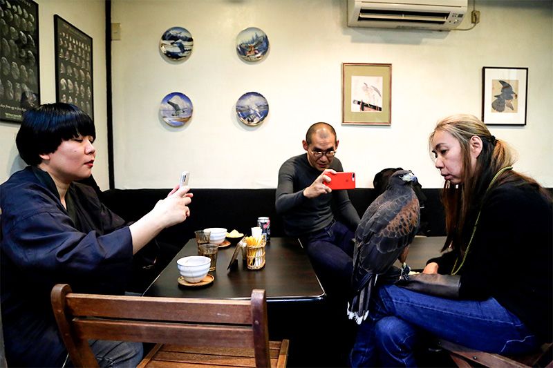 店主の奥さまも鷹匠(右)。店内にいるのは全て鷹匠によって訓練されている鷹だが、自分の飼っている鷹を連れてくることもできる