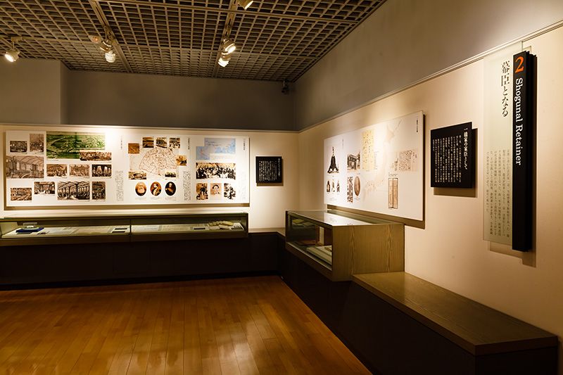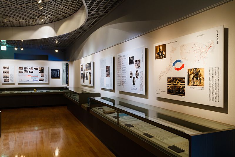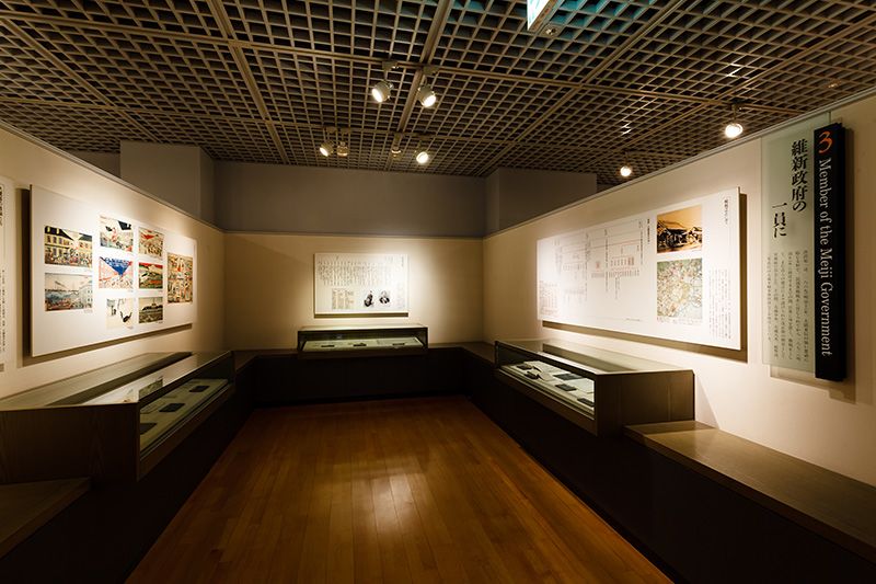 展示「維新政府の一員に」。近代日本の基礎作りのために、幅広い分野の仕事をこなしたことが分かる