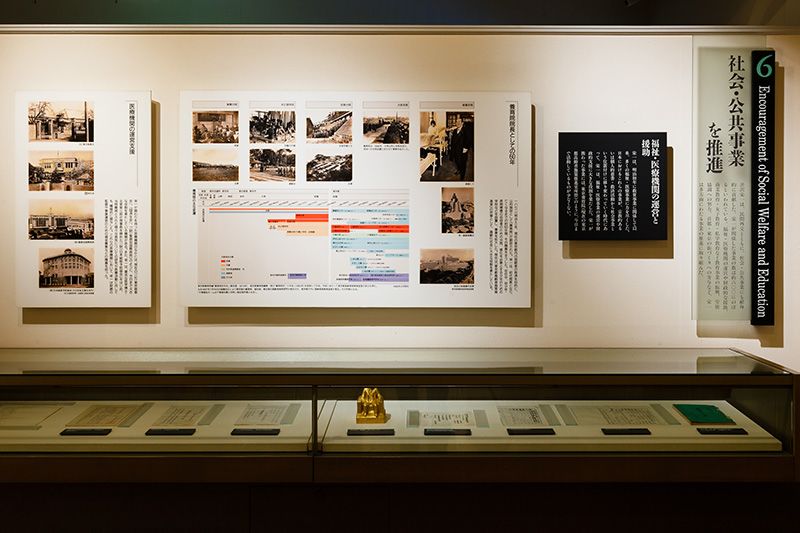 展示「社会・公共事業を推進」。「東京養育院」の事業を中心に、社会福祉・医療、教育支援、社会資本整備事業などを紹介している