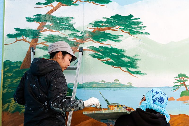 ペンキ絵の剥がれた箇所を削り取り、空色から塗っていく。はしごの上にいるのは、田中みずきさんのパートナーで、便利屋を営む駒村佳和さん