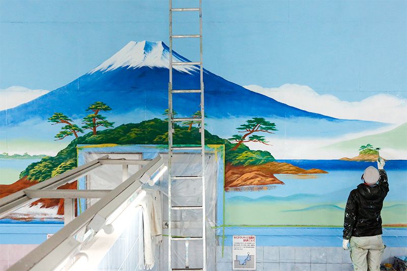 1月のある日、田中さんは東京都江戸川区葛西の「仲の湯」で朝8時ごろから女湯の湯船に足場を組み、ペンキ絵の作業に取り掛かっていた。銭湯の定休日に丸1日かけて女湯、男湯の絵を仕上げる予定だ。絵の大きさは、幅約6メートル、(湯船からの)高さ3メートルほど。はしごをかけて、天井付近の空から塗っていく。