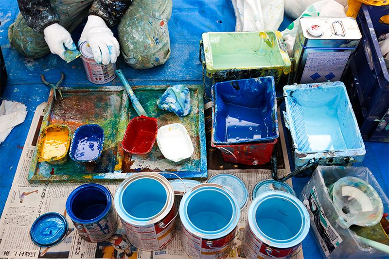 ペンキは油性の外壁用ペンキを使用。三原色の黄・赤・青と白を調合してさまざまな色を作り出す