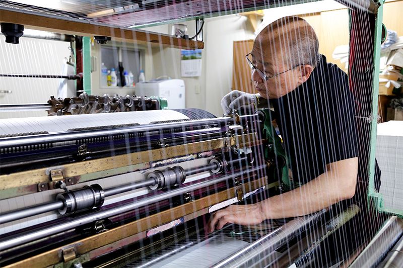 稼働年数50年以上。見るからに年季が入ったアナログな罫引き機に1枚1枚紙が送り込まれ、ローラーを通過して薄紫色の罫線が規則正しく引かれていく様子は圧巻だ。井口博司さんは淡々と紙をセットし、インクや罫線を引くペン先の状態などをこまめにチェック。罫線が引かれた紙はまとめて別の場所に移す。方眼紙の場合には、紙が乾燥後に90度角度を変えて2回目の罫線が引かれる。一連の作業を手際よくリズミカルにこなしていく井口さんの技術があればこそのツバメノート。ベテランの職人技術者とがっちりスクラムを組むことで、上質で書きやすいノートが生まれる。
