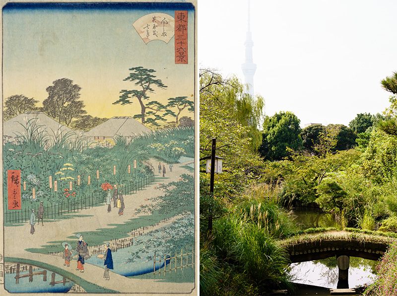 歌川広重二代(1826-1869)による「向しま花屋敷七草」(東都三十六景より)。園内奥にある池からは、土橋とスカイツリーのコラボレーションも楽しめる(右)