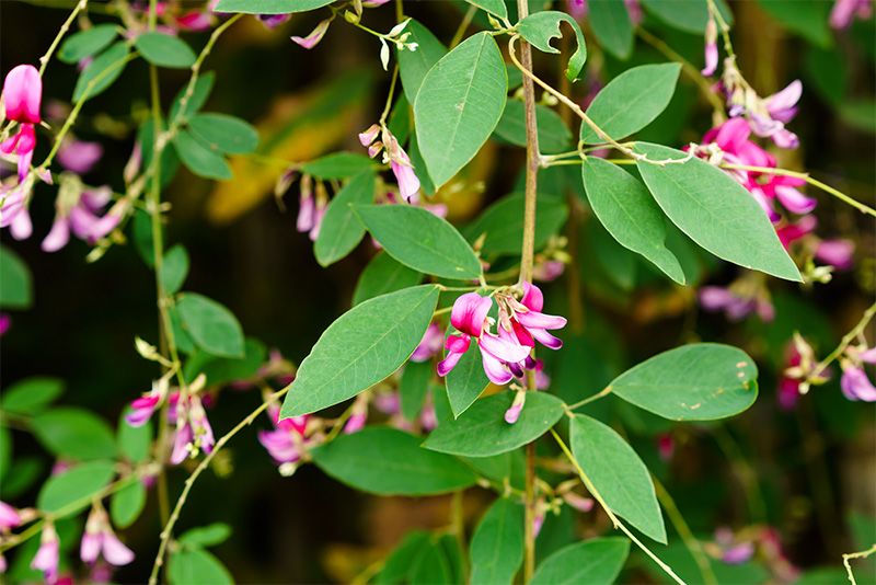 宮城野萩。葉の先が尖(とが)っているのが特徴で、花は大きく紅紫色をしている。「萩のトンネル」で見ることができる