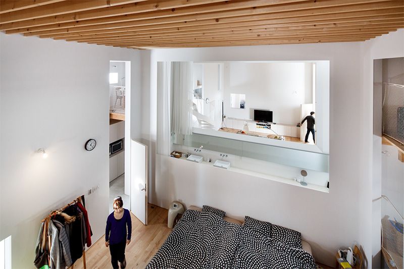 白く塗装したアカマツ材の外壁に囲まれた吹き抜けの空間に、親子4人が暮らす。田畑が広がる周囲の風景ともよくなじんでいる。窓が小さいため、外部から閉ざされているように見えるが、白を基調とした室内は、実は光が差し込んでとても明るい。それぞれのスペースはゆるやかにつながっており、家族全員が共有する大きな一つの部屋という印象を与える。
