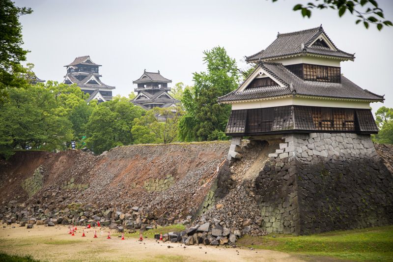 Замок Кумамото в апреле 2016 года после того, как он был поврежден в результате землетрясения (Фотография Хасино Юкинори, Nippon.com)