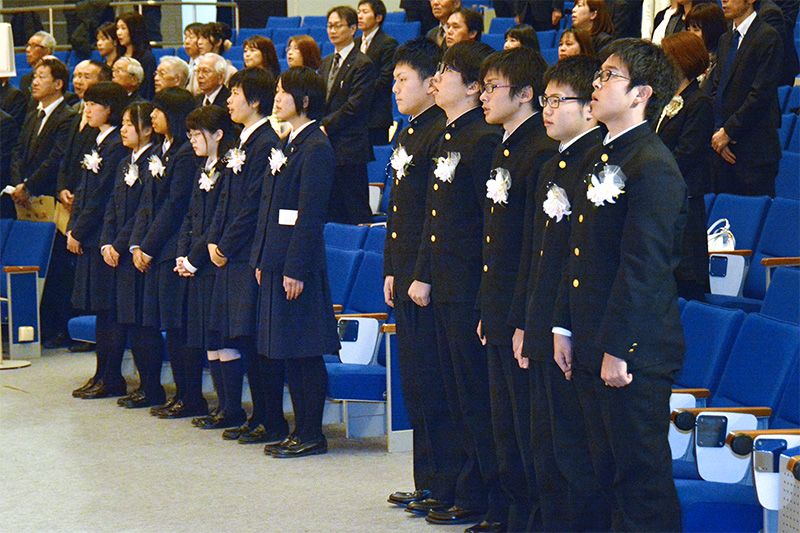 Родители и выпускники прошлых лет приняли участие в церемонии, чтобы поздравить 111 выпускников пяти средних школ, находящихся в ведении преф. Фукусима.