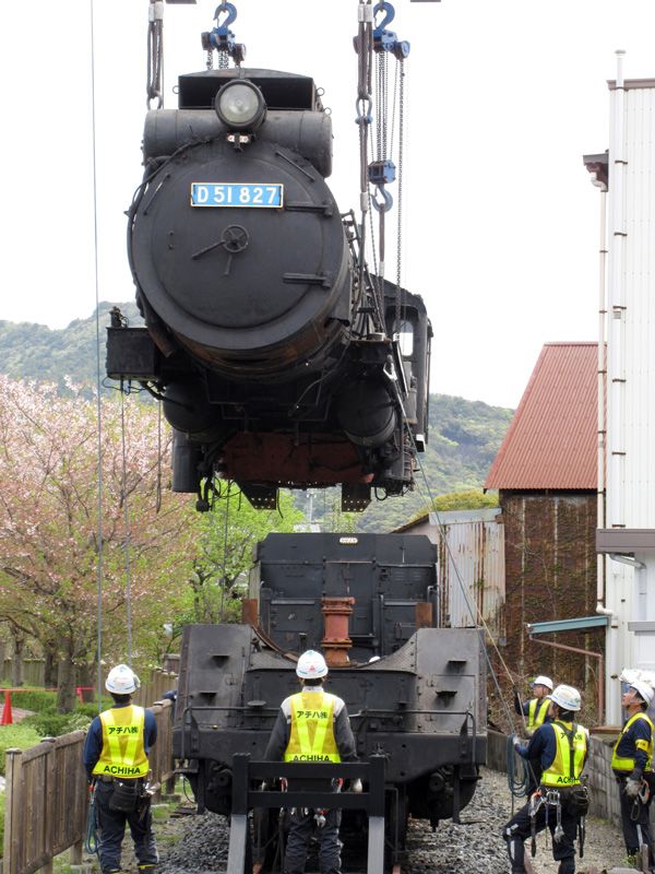 Паровоз, весящий 78 тонн, разобрали на три части и перевезли в Аридагаву 18 апреля, где его смонтирует компания Achiha. К паровозу прицепят и тендер (угольный вагон) весом в 22 тонны.