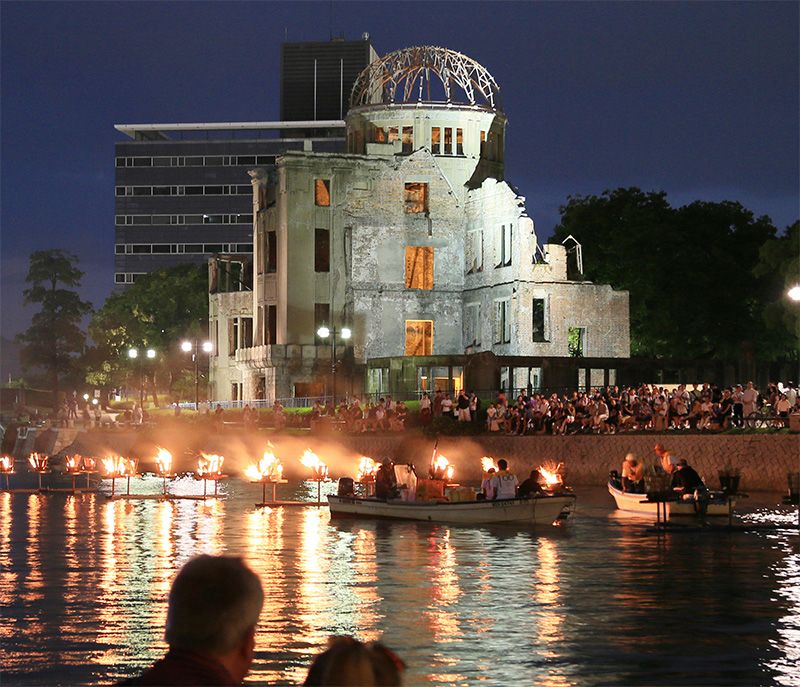 Вдоль реки Мотоясу в Хиросиме 5 августа, накануне годовщины бомбардировки, зажигают огни, чтобы напомнить о жертвах атомной бомбы и призвать к миру во всём мире. (© Jiji)