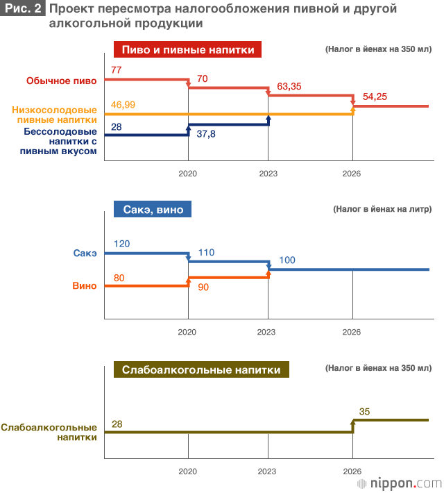 В настоящее время система налогов на «пиво и пивные напитки» предусматривает три категории в зависимости от содержания солода, исходного сырья и способа производства: пиво, хаппосю – пивные напитки с низким содержанием солода (до 25%), а также напитки «новых жанров» (бессолодовые) с пивным вкусом. Величина налога на алкогольную продукцию рассчитывается отдельно для каждой категории: она составляет соответственно 77 йен, 47 йен и 28 йен (во всех случаях из расчёта на 350-миллилитровую банку). В ближайшие 10 лет предполагается постепенно свести налог к единой ставке величиной 54 йены, ликвидировав разницу налогов для пива и прочих продуктов пивоварения путём расширения общего определения пива и т. п.